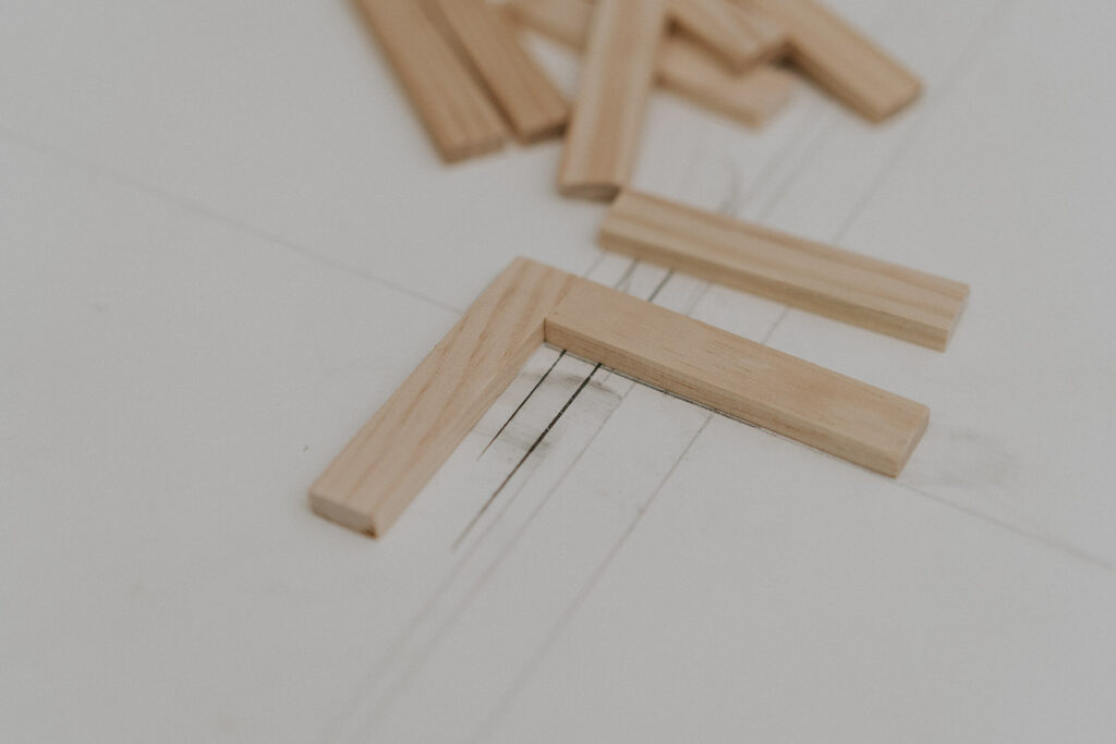 Ab jetzt wird es einfach! Ihr legt die Hölzer immer im 90 Grad Winkel aneinander. Orientiert euch hier immer an den ersten Hölzern und nehmt ruhig ein klassischen Fischgrätenmuster als Vorlage. Ich habe hier eine zum Download bereitgestellt.