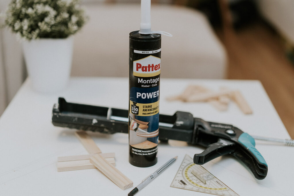 Wichtig ist, dass ihr jedes einzelne Hölzchen fixiert. Ihr könnt hierfür Holzleim nehmen (dann solltet ihr die Tischplatte vorher etwas anschleifen) oder wie ich einen Montagekleber. Da reichen 3 kleine Klebepunkte auf jedem Hölzchen und ihr könnt Reihe für Reihe durchlegen.