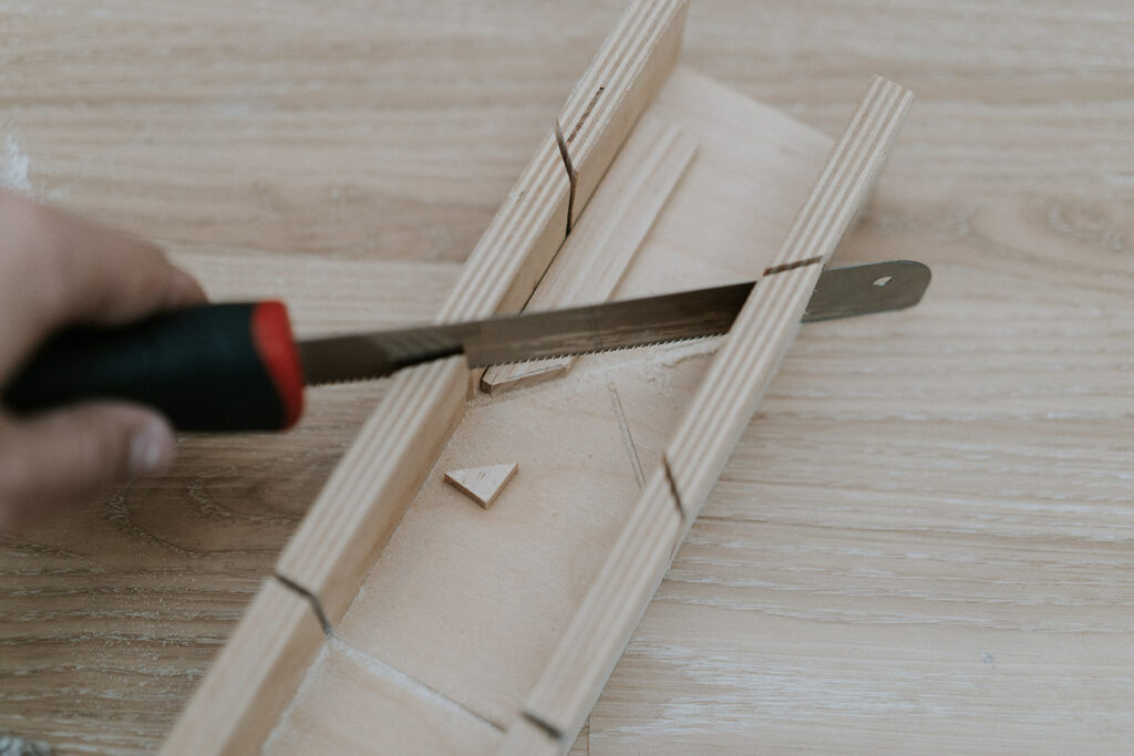 An dieser Markierung sägt ihr eure Hölzchen nun zu, damit es später ein bündiger Abschluss mit der Tischplatte wird. Ich habe jedes Hölzchen von Hand in einer Schneidlade gesägt. (Ihr könntet hier natürlich auch eine Kappsäge verwenden.)