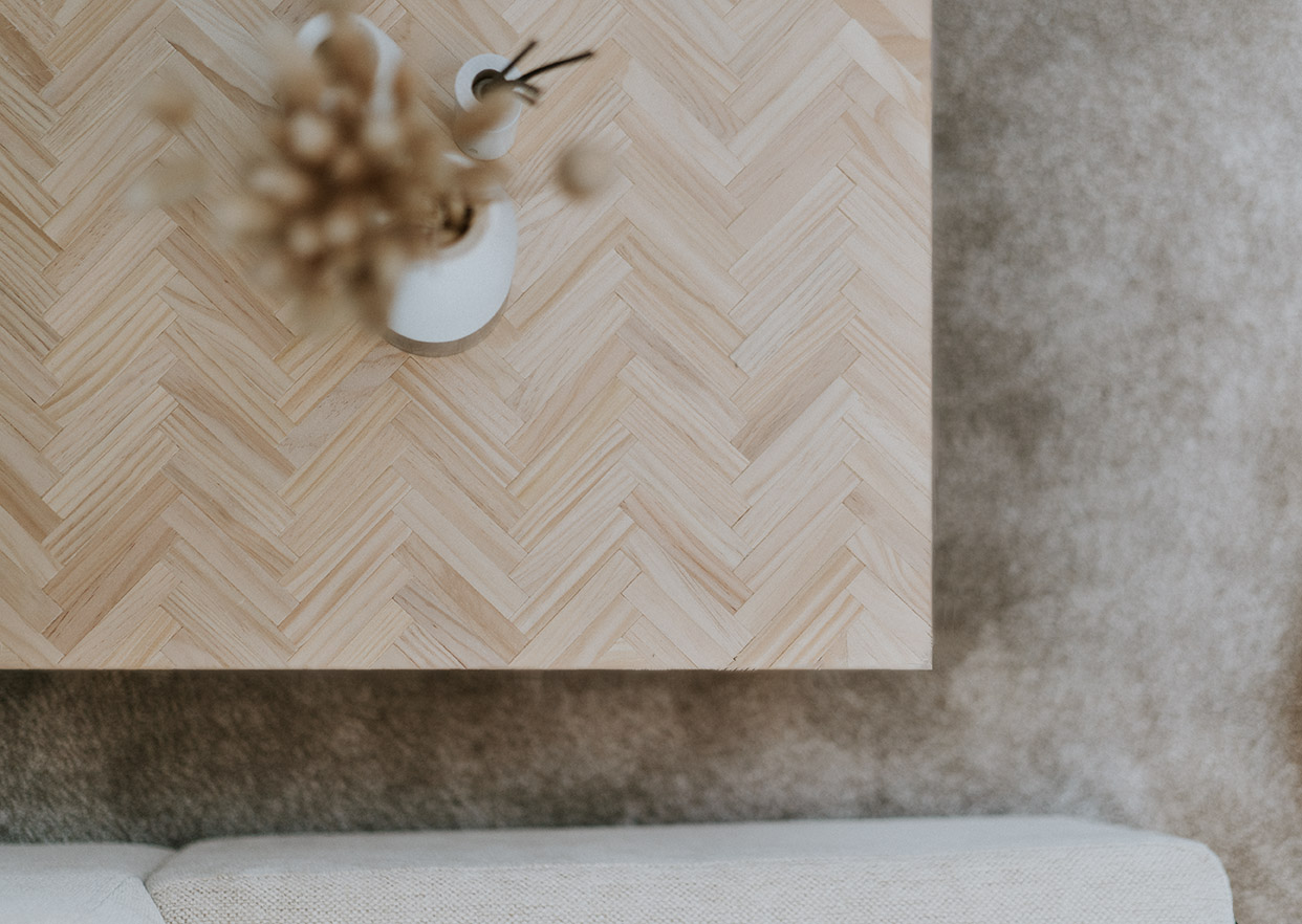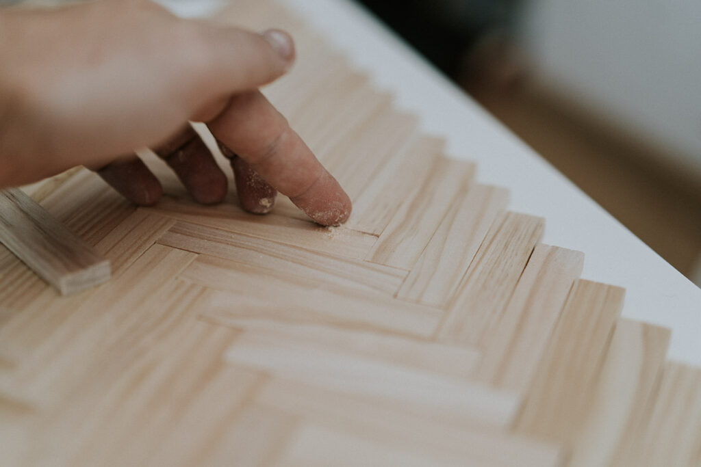 Solltet ihr alle Hölzer für die Kanten zugesägt und geklebt haben, dann könnt ihr den Tisch und das Fischgrätenmuster finalisieren und veredeln.