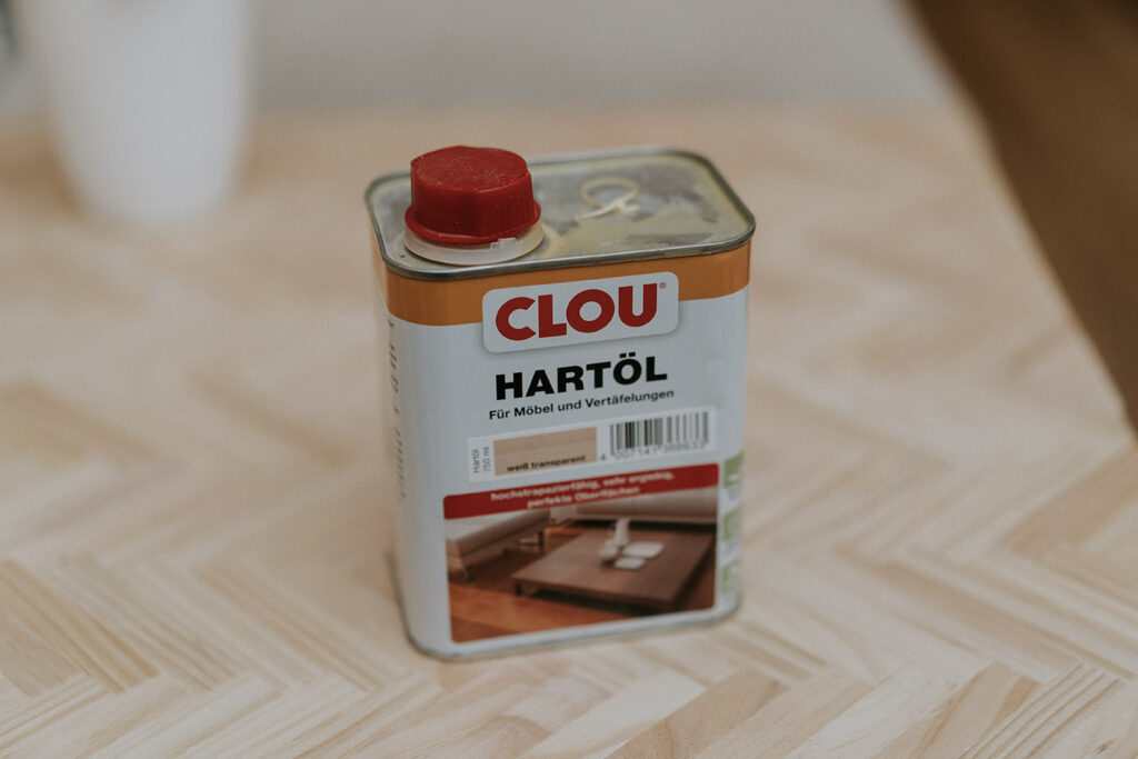 Tipp: Um eventuelle kleine Lücken und Unebenheiten auszugleichen habe ich die Sägespane in die Fugen eingestrichen und alles dann einmal leicht angeschliffen. Für die endgültige Veredelung habe ich die gesamte Fischgräten-Platte dann noch farblos geölt.