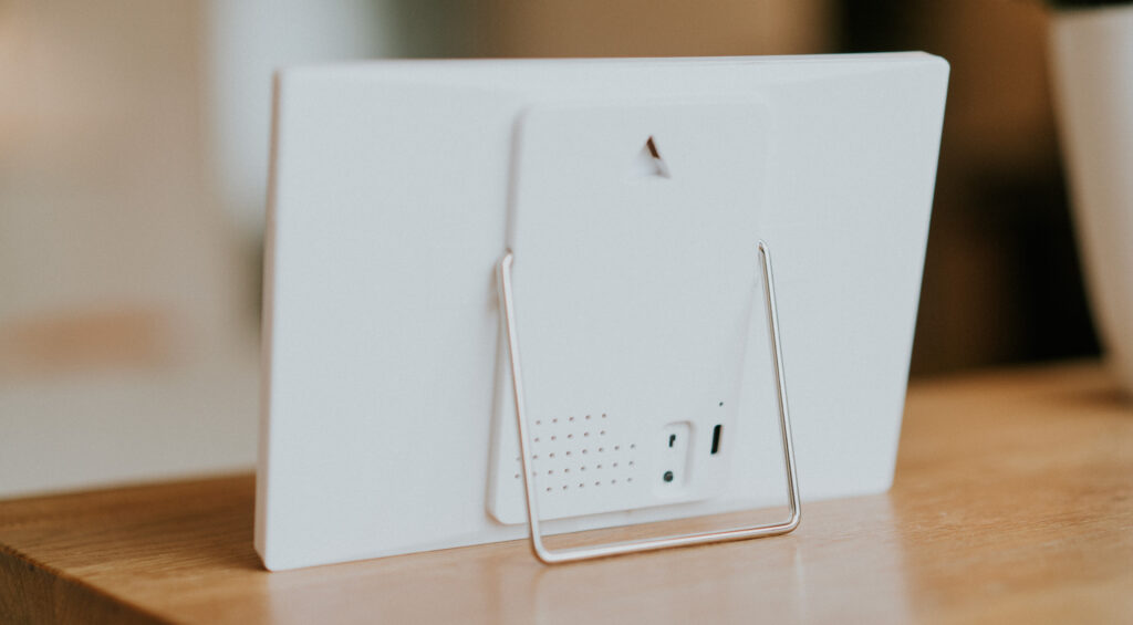 Mit seinen Abmessungen von 171 × 116 × 10 mm ist das Display angenehm unauffällig. Man kann es an die Wand hängen oder aufstellen. Für Letzteres ist ein kleiner Metallfuß integriert.