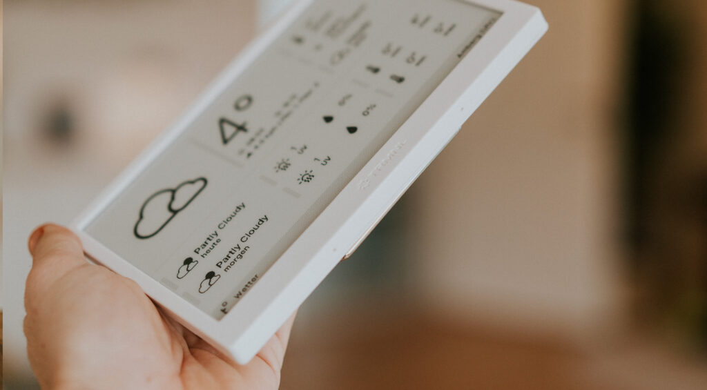 Der Akku ist eines der zentralen Argumente für das Gerät. Die Idee: Strom wird nur dann verbraucht, wenn sich der Bildinhalt ändert. Keine Hintergrundbeleuchtung, kein Dauerbetrieb. Wer möchte, kann gegen Aufpreis auch einen größeren 2.500-mAh-Akku bestellen, der – je nach Aktualisierungsintervall – ein halbes Jahr oder länger durchhalten soll.