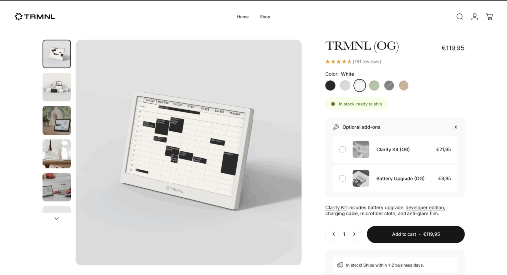 Bestellen könnt ihr das TRMNL direkt im eigenen Onlineshop. (Werbung unbezahlt). Versendet wird es aus einem Warenlager in Deutschland (Berlin) und kommt daher in 2-3 Werktagen bei euch an.